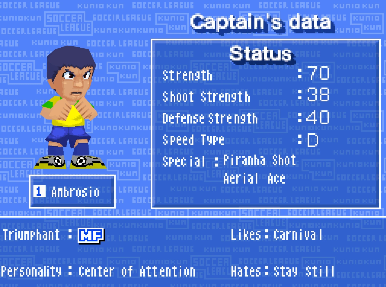 Diaz debuts in Kunio-kun's Nekketsu Soccer League as the captain of the Brazilian team.