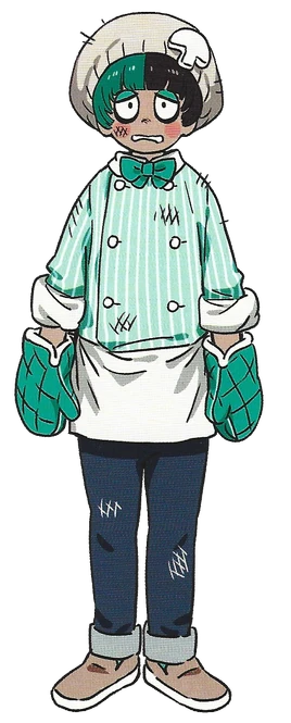 Enoki first appears inside of Primo's kitchen where the protagonists mistake him for Primo and get ready to fight. Enoki clears up the confusion and states that he works for Primo, though starts to get defensive about Primo's talents when the group assumes that he's not using a real name. When asked why he's tied to chains, he tells the protagonists that Primo does so in order to keep his staff focused. The group offers to break him free which gets Enoki happy, but he gets worried about what would happen if Primo ever found out. When told by the group that they're on their way to fight Primo, Enoki gets excited and hands the protagonists a keycard to Primo's TV studio. The protagonists ask what he plans on doing after, to which he talks about opening up his own food truck.