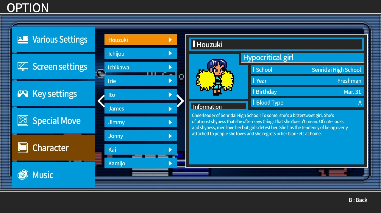 Hōzuki debuts in River City Super Sports Challenge ~All Stars Special~ as the cheerleader for Senridai High School's team.