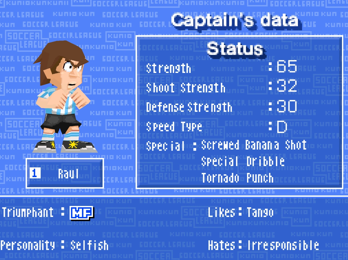 Latorre debuts in Kunio-kun's Nekketsu Soccer League as the captain of Argentina's team.
