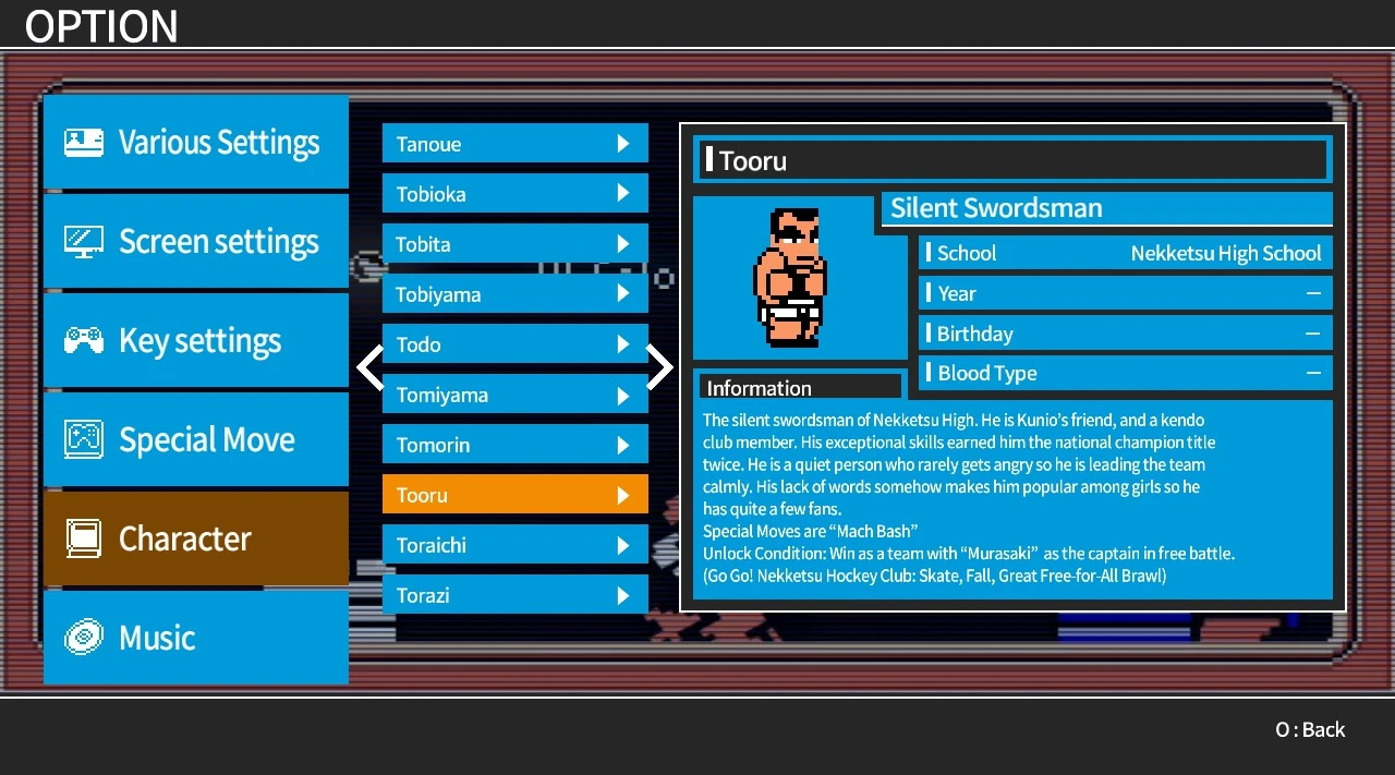 Tōru (とおる) is a student at Nekketsu High School who was first featured in Go-Go! Nekketsu Hockey Club Slip-and-Slide Madness. He is a member of his school's kendo club and is a friend of Kunio. He is described as being a quiet person who is able to lead his team calmly and had earned the title of being the national champion in kendo twice. Tōru's lack of words has made him popular among the girls.[1]